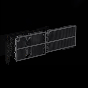Dimensions revues à la hausse Les ventilateurs axiaux tournent sur des roulements à billes doubles et ont été agrandis pour propulser 21 % d’air en plus à travers la carte, ce qui permet de réduire les températures, le bruit et les performances.