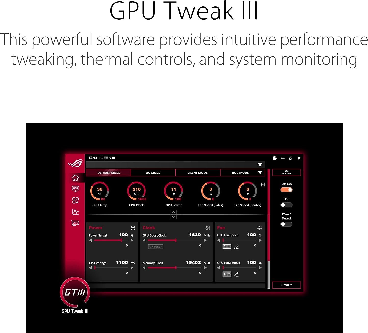 ASUS GPU Tweak III est plus intuitif et offre plus de fonctionnalités que jamais. Son interface remaniée offre une plus grande accessibilité en intégrant les fonctions principales dans un tableau de bord centralisé, tandis que notre tuner Tension-Fréquence a été revu pour rendre la gestion des performances encore plus facile. Des atouts supplémentaires, tels que la technologie de ventilateur 0dB, un affichage à l’écran entièrement personnalisable et des capacités de suivi, vous permettent de tirer le meilleur parti de votre carte graphique. De plus, Profile Connect vous permet de tout réunir de manière fluide pour chaque application et tâche créative.