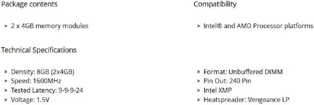 Les dissipateurs de chaleur Vengeance Low Profile ont une hauteur réduite de 1,03 pouce (26,25 mm). Ils sont conçus pour les systèmes hautes performances équipés de dissipateurs pour processeurs de grande taille, les PC de petite taille et toute autre application à espace restreint susceptible d’empêcher l’utilisation de kits mémoire Vengeance standard.