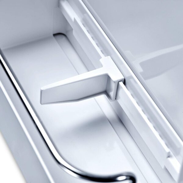 Compartiment congélateur amovible breveté. Offre une solution 3 en 1 : réfrigérateur, congélateur ou les deux en même temps. Le réglage de la température et la vitesse de compression assurent une consommation d’énergie très efficace. Bord biseauté à l’arrière pour une utilisation optimale de la place à bord. Les verrous à double fonction servent également de rotation du ventilateur du réfrigérateur s’adapte à la température ambiante et assure ainsi un bruit minimal. Cadre de montage standard ou affleurant en tant qu’accessoire. Disponible en