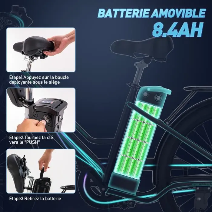 Le batterie peut être retirée et rechargée:De plus, Le batterie de vélo peut être retirée et rechargée, c’est plus pratique et sécuritaire.