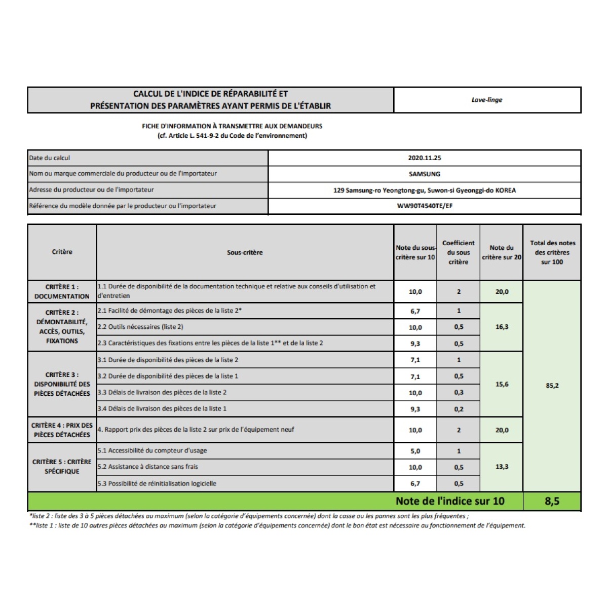 Description – Lave-linge – Samsung – Lave-linge frontal 60cm 9kg 1400 tours/min – ww90t4540te – SAMSUNG