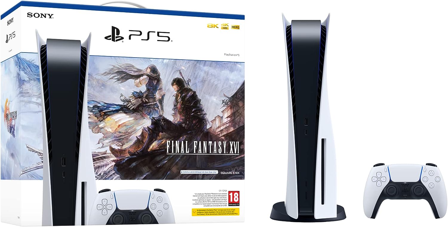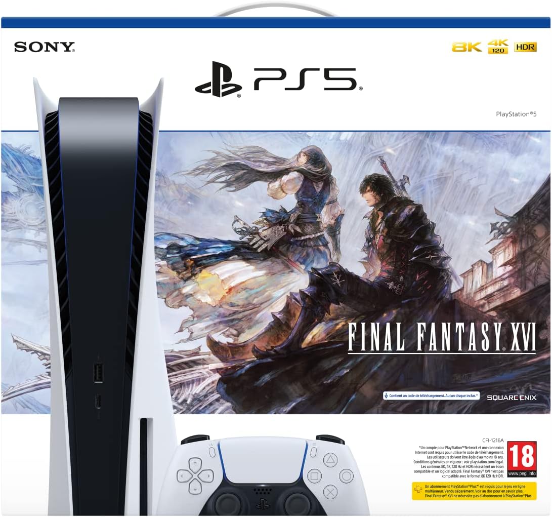 Plongez dans le monde de dark fantasy de Valisthéa avec le pack console PlayStation®5 – FINAL FANTASY XVI. Jouez à FINAL FANTASY XVI sur PS5 avec des innovations comme la 4K et la HDR*, le retour haptique de la manette sans fil DualSense™ et la vitesse incroyable du SSD de la PS5. * La 4K et la HDR nécessitent un écran ou un téléviseur compatible 4K et HDR.