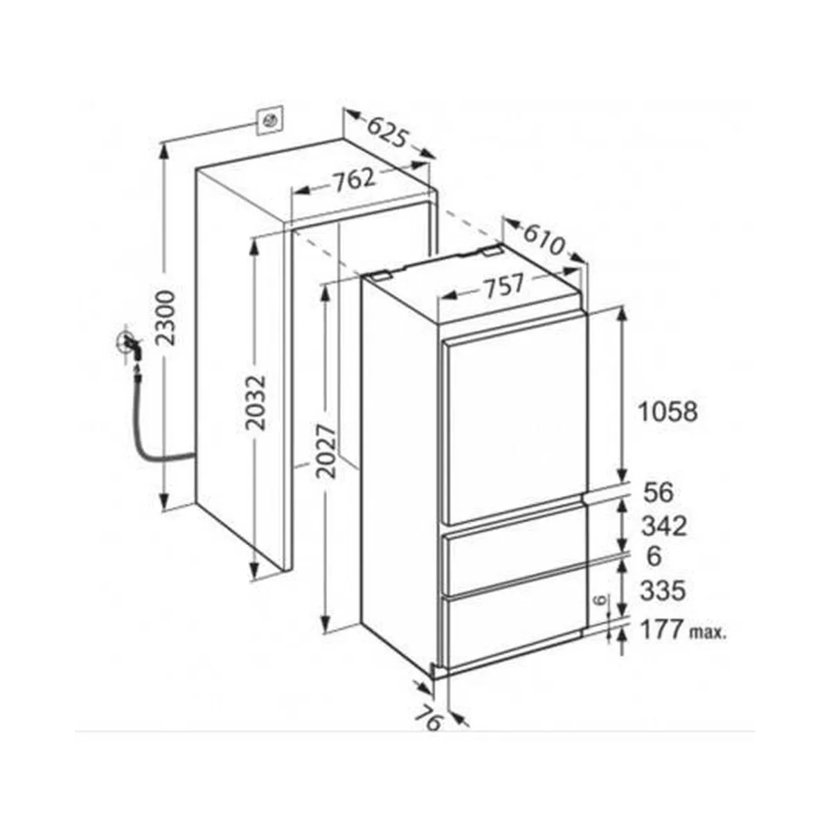 Combiné intégrable ,Largeur 75 cm , Hauteur 203 cm , Volume utile total 401 litres , Réfrigérateur Biofresh