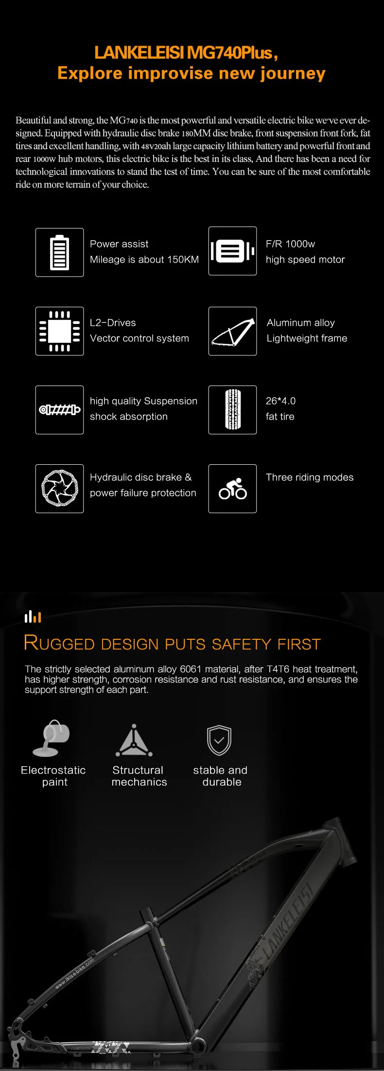 Vélo électrique LANKELEISI MG740PLUS 45km/h 1000W moteur Pneus 26 » 20Ah Noir