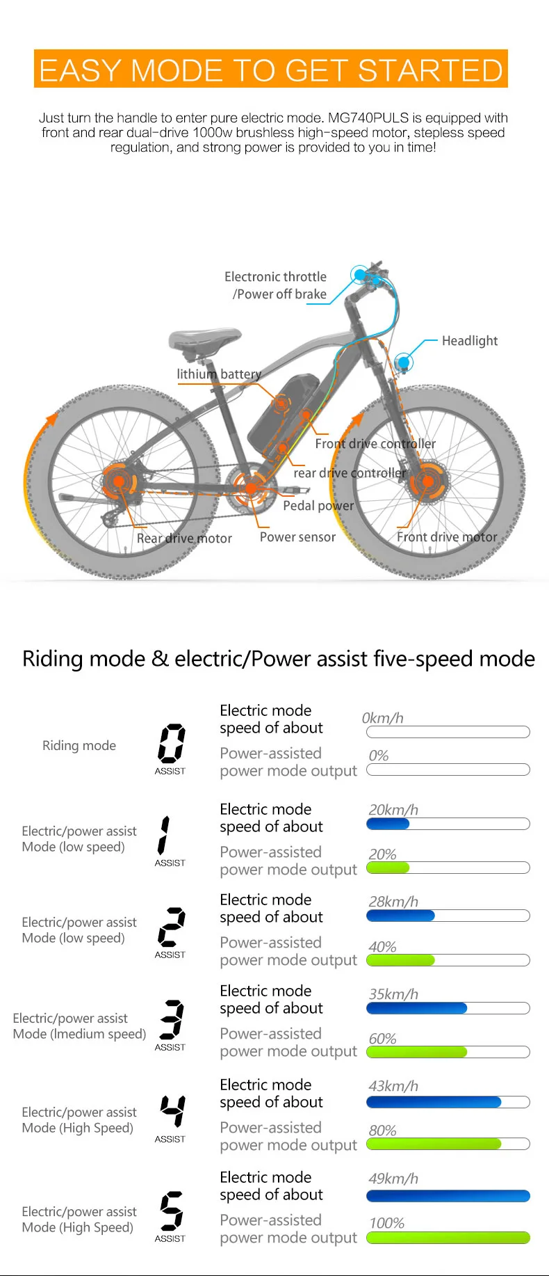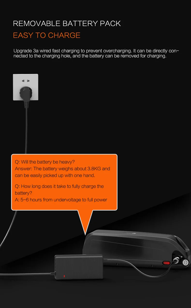 Batterie au lithium amovible 48V 20AH complètement cachée à l’intérieur du cadre, étanche à l’eau et à la poussière, double protection, sortie forte, toujours stable, facile à charger. Il peut atteindre un kilométrage d’environ 60KM en mode électrique pur et d’environ 120KM en mode assisté.