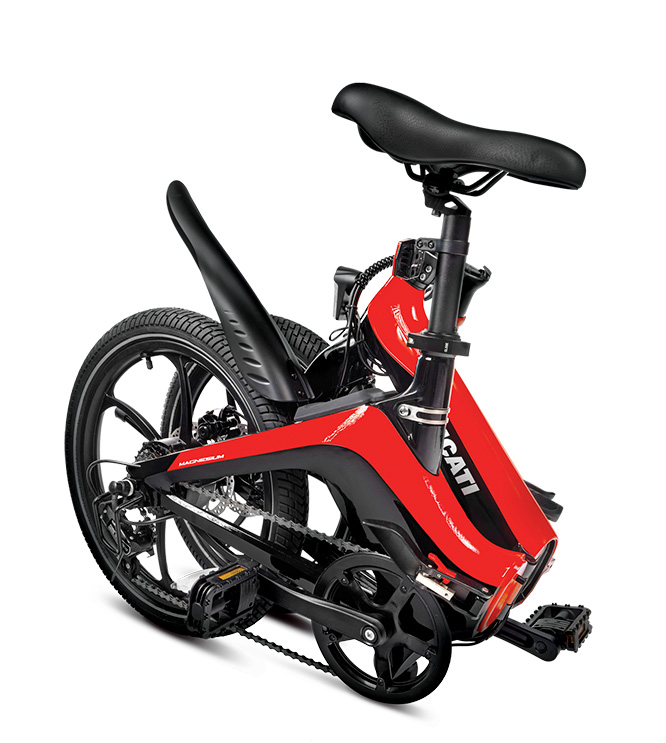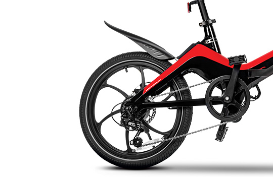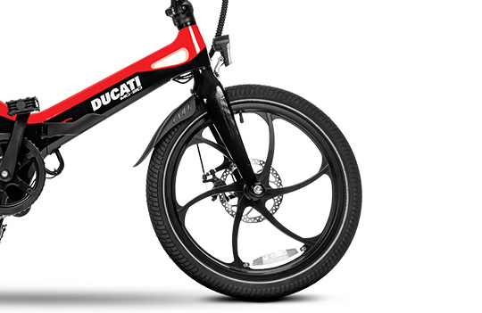 MG-20 est le premier vélo électrique pliable de Ducati. Le profil fluide et les lignes nettes des jantes expriment un caractère sportif, au design distinctif et des formes plus aérodynamiques.